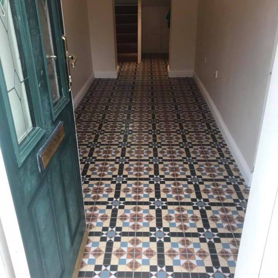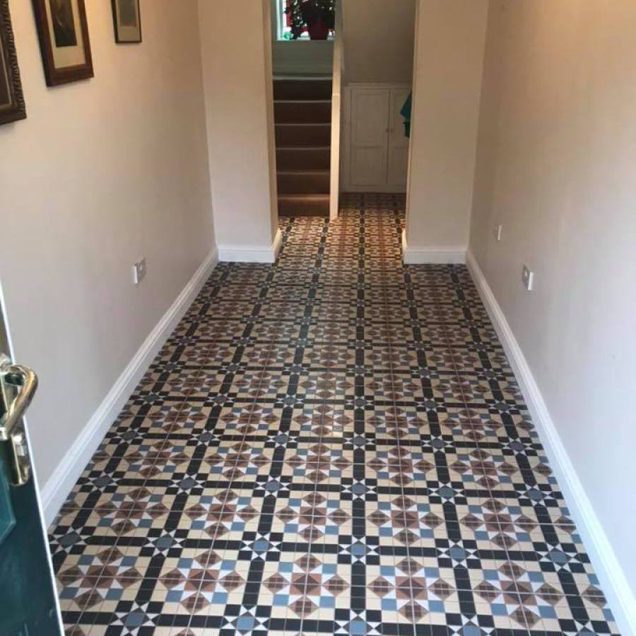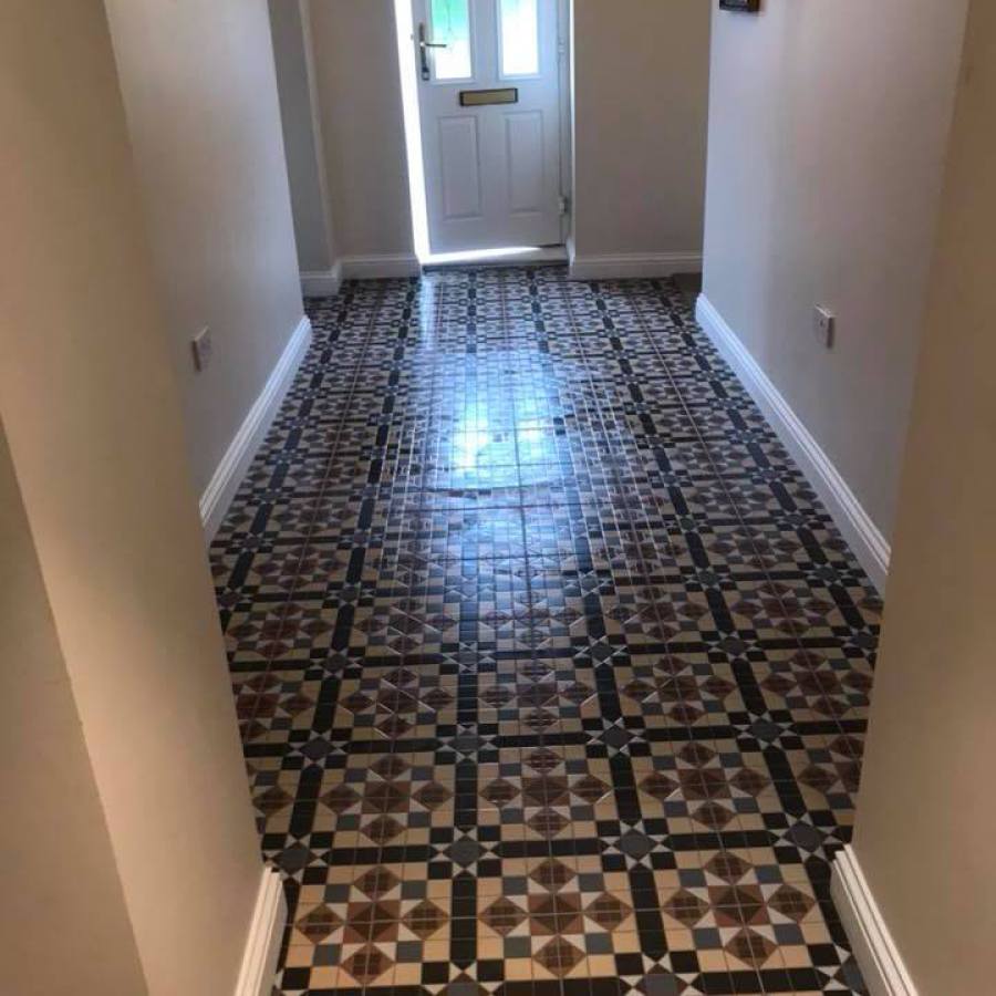 Customer wanted their old carpet removed to open up the hallway. The carpet was removed and skirting taken off. Floor was prepared, new Victorian tiles were laid and new skirting was fixed to give the edges a clean finish
